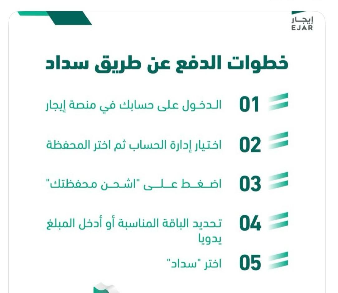خطوت السدد عن طريق المنصة 1/ الدخول على حسابك فى منصة ايجار 2/ اختيار ادارة الحساب ثم اختر المحفظة 3/اضغط على اشحن محفظتك 4/تحديد الباقة المناسبة او ادخل المبلغ يدويا 5/اختر سداد